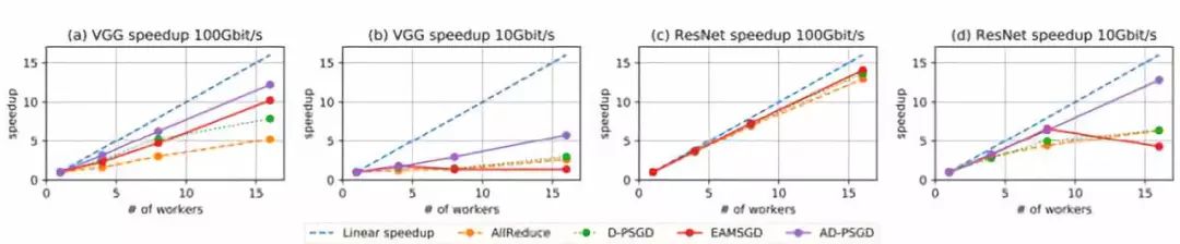 下图则展示了各种方法在 CIFAR10 上为 VGG(通信密集型)和 ResNet-20(计算密集型)模型带来的加速情况。可以明显看到 AD-PSGD 一直都有最优的表现。