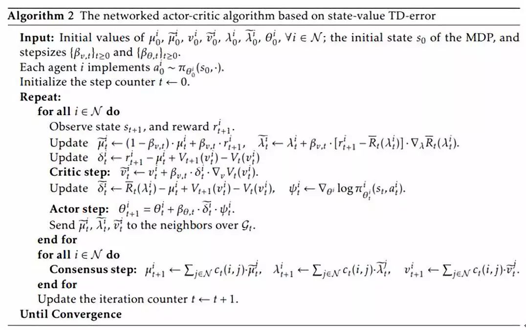 在多智能体强化学习(MARL)问题中,多个智能体的联合行动会影响它们所处的共同环境。在每个状态,每个智能体都会执行一个动作,这些动作共同决定了环境的下一个状态和每个智能体的奖励。此外,这些智能体可能针对的是不同的任务,会有不同的奖励函数;但每个智能体都只能观察自己的奖励。每个智能体都会基于局部观察到的信息以及从网络中的临近智能体接受到的信息各自做出决策。在这种设置内,所有智能体的整体目标是通过与其临近智能体交换信息而最大化在整个网络上的全局平均回报。
