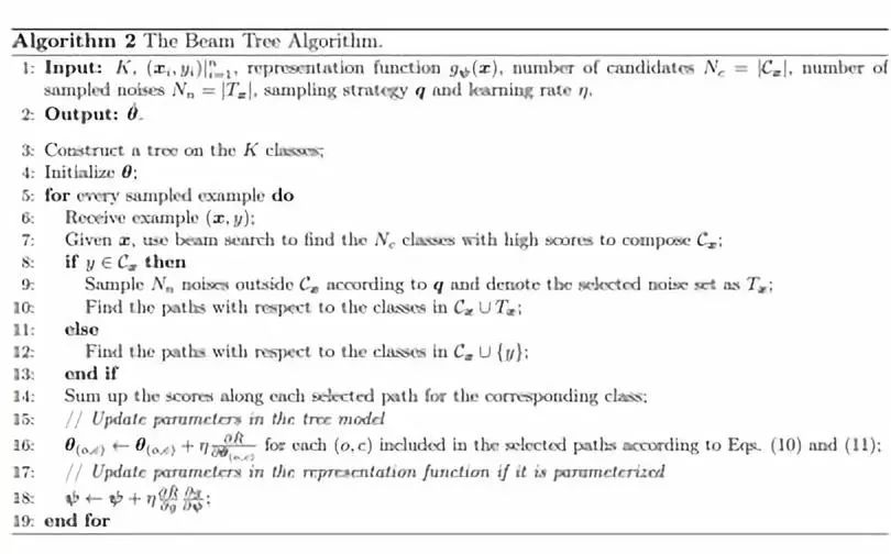 另外,研究者还使用了一种树结构(叶表示类别)来促进对候选项选择的快速波束搜索(算法 2)。这种波束搜索具有更低的复杂度,能快速得到预测结果,还能自然地输出最靠前的多项预测。