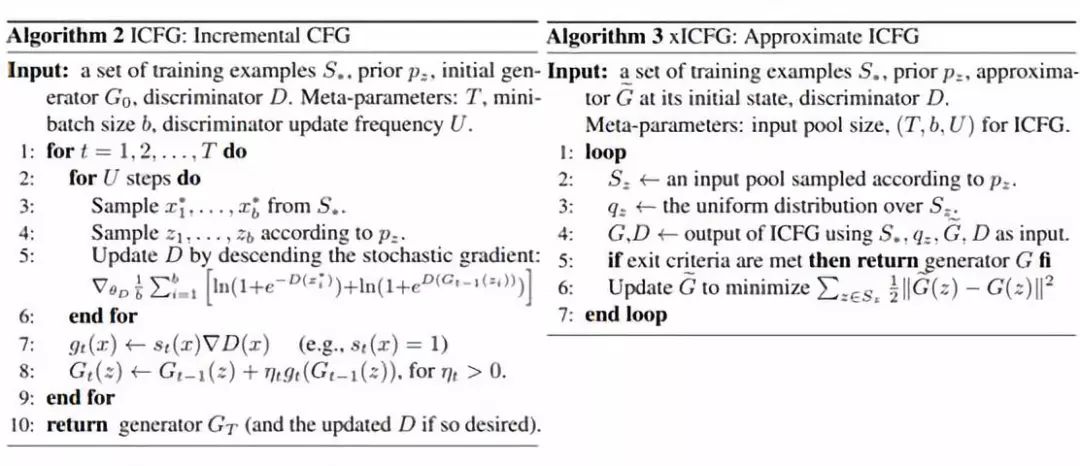 在此基础上,研究者又提出了渐进式 CFG(ICFG,见算法 2)以及更进一步的近似式 ICFG(xICFG,见算法 3)。其中 ICFG 是以渐进方式使用生成器的更新一点一点地逐步更新鉴别器,使得生成器可以不断提供新的更有难度的样本,从而防止鉴别器过拟合。而 xICFG 则能通过训练一个固定大小的近似器(近似 ICFG 所获得的生成器的行为)来对 ICFG 得到的生成器进行压缩,从而提升效率。