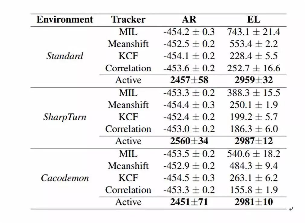 实验结果表明,这种端到端的主动跟踪方法能取得优异的表现,并且还具有很好的泛化能力,能够在目标运动路径、目标外观、背景不同以及出现干扰目标时依然稳健地执行主动跟踪。另外,当目标偶尔脱离跟踪时(比如目标突然移动),该方法还能恢复对目标的跟踪。下表给出了不同跟踪方法在 ViZDoom 环境的几个不同场景上的表现比较,其中 AR 表示累积奖励(类似于精确度),EL 表示 episode 长度(类似于成功跟踪的持续帧数)。