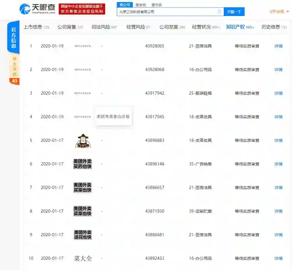 天眼查数据显示,近日,美团的运营主体北京三快科技有限公司新增多个生鲜商标注册信息,包含“美团外卖买菜也快”“菜大全”“美团外卖青山计划”等商标在近期多次申请,目前显示多个系列商标还在等待实质审查中。此外,美团还申请了“美团外卖送花也快”“美团外卖买药也快”等商标。(36氪)