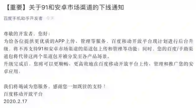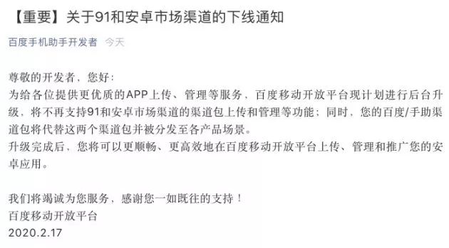 2 月 17 日,百度移动开放平台发布关于 91 和安卓市场渠道的下线通知,通知称,百度移动开放平台现计划进行后台升级,将不再支持 91 和安卓市场渠道的渠道包上传和管理等功能。用户的百度 / 手助渠道包将代替这两个渠道包并被分发至各产品场景。(TechWeb)
