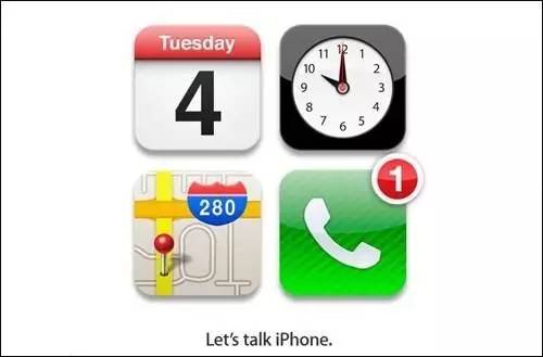 2011年10月4日,苹果举办了一场主题是“让我们谈谈iPhone”的发布会,正式发布了iPhone 4s。比较巧妙的是,苹果用四款应用图标准确地传达了这次发布会的时间和地点。