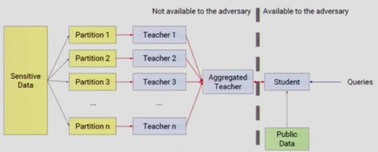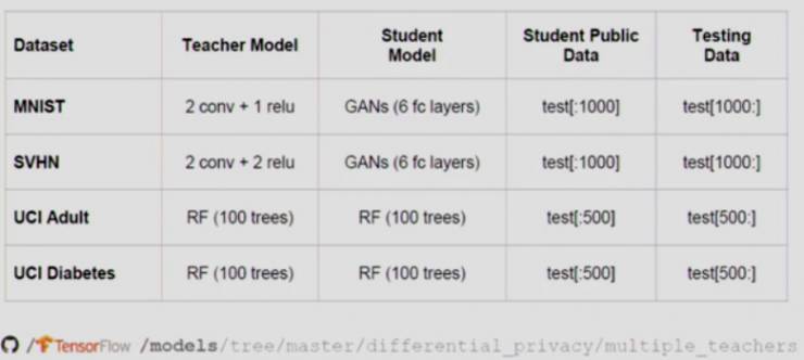 另外,我们要防范攻击者探取模型底层函数库。「教师模型」是由隐私数据训练的,「学生模型」是由公共数据训练的,带有隐私保护的标注。所以最坏的情况是,攻击者通过查验「学生模型」的底层函数库而获得其训练数据,也只能得到带有隐私保护的标注信息,除此以外攻击者得不到再多的隐私信息了。