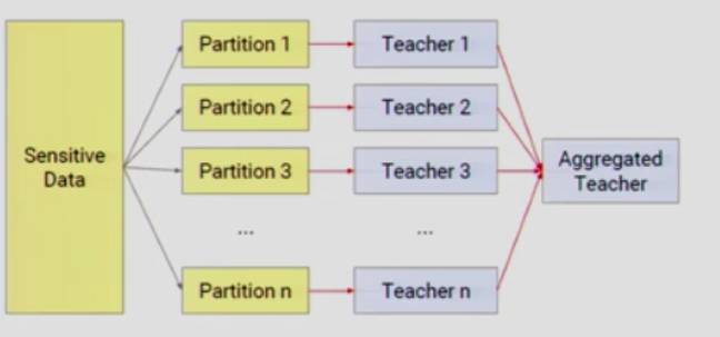 起初,我们将敏感数据分割为 N 个互斥的不同数据集,然后由这些数据集分别独立训练不同的模型,得到 N 个「教师模型」。当我们部署训练好的「教师模型」时,我们记录每一个「教师模型」的预测结果,选取票数最高的那个,将预测结果聚合起来。