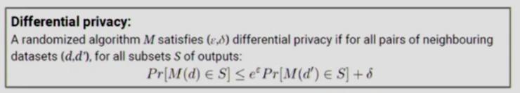 对于相近的数据集(d,d'),随机的算法 M 满足(ε,δ)差分隐私,那么两个查询数据库(d,d')的查询结果在概率上接近。写成公式就是: