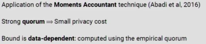 我们应用了 Moments Accountant 技巧,来自去年的一篇论文(Abadi et al,2016),可以对「教师模型」设置一个强固定数(strong quorum),从而带来小隐私成本。另外,差分隐私范围(bound)是依赖于数据的。