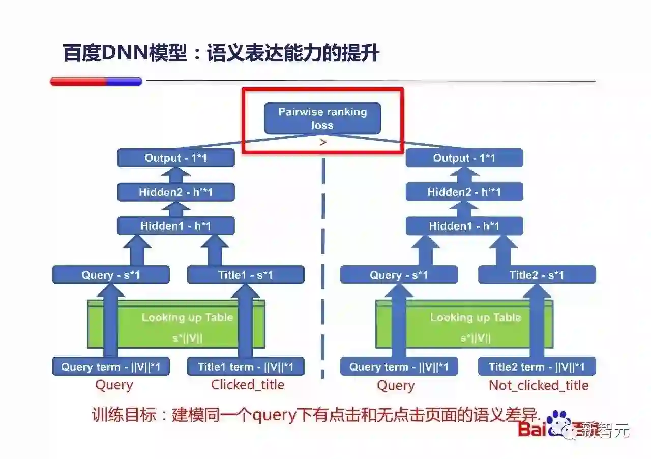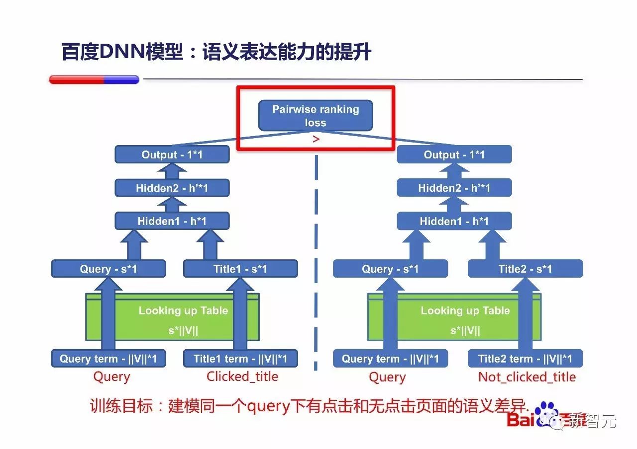该DNN模型的训练是通过同一个Query下有点击和无点击的title构成Pair来进行Pairwise loss的训练的。这样构建训练样本的好处(比如相对DSSM来说),它能够在原有百度很好的页面相关性的基础上进一步捕获微妙的语义差别,让模型来专注于语义的差别。