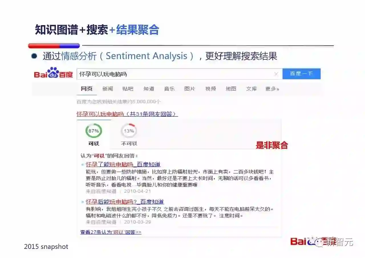 比如非常多人在百度上搜索『孕妇可以』打电话么?吃柿子么?玩电脑么?……或者『蚕丝被能够放在太阳下晒么』这样的问题,往往没有绝对的答案,这时候通过情感分析和知识图谱,百度能够告诉用户说有80%的人说可以,20%的人说不可以。您需要自己判断一下。 :)