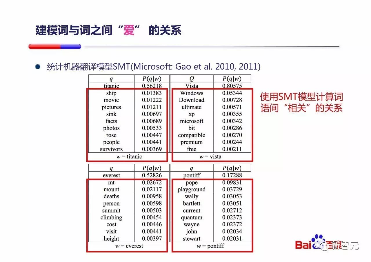 建模词与词之间『爱』的关系的一个有价值的工作是Gao Jianfeng在微软做的一个基于统计机器翻译(SMT)的一个模型,它通过SMT来计算词语之间『爱』的关系。