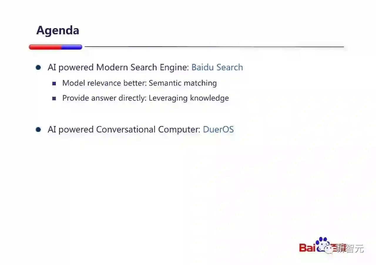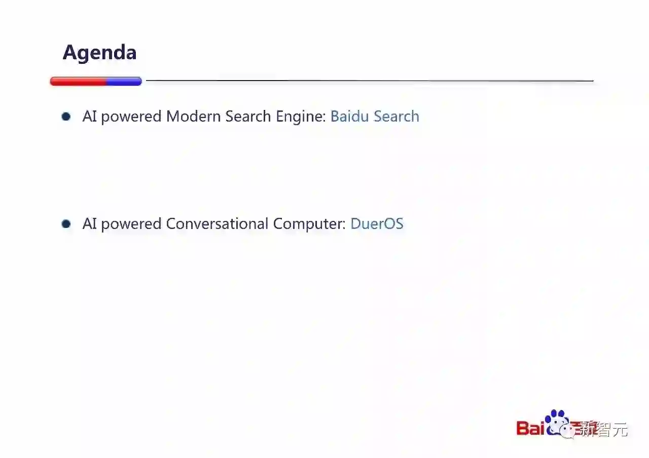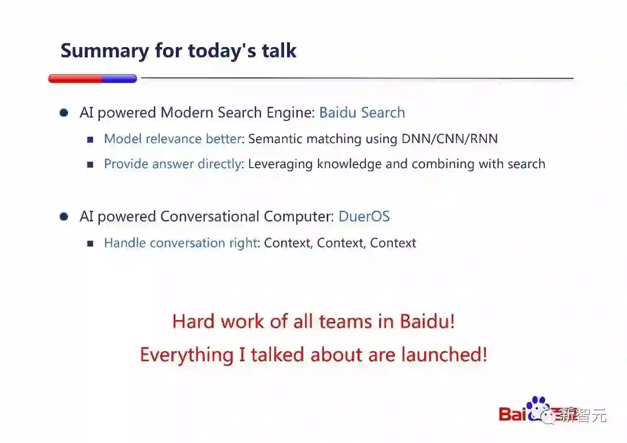 总结一下今天的演讲,AI现在逐步深入人们生活的方方面面,赋能各种产品。我们今天讨论的是AI赋能的现代搜索引擎(百度搜索)和AI赋能的对话式计算机(DuerOS)。