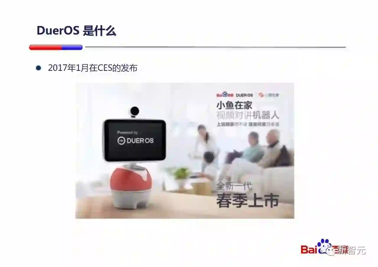 在2017年1月的CES上,百度联合小鱼在家发布了第一款搭载DuerOS操作系统的智能家用机器人。