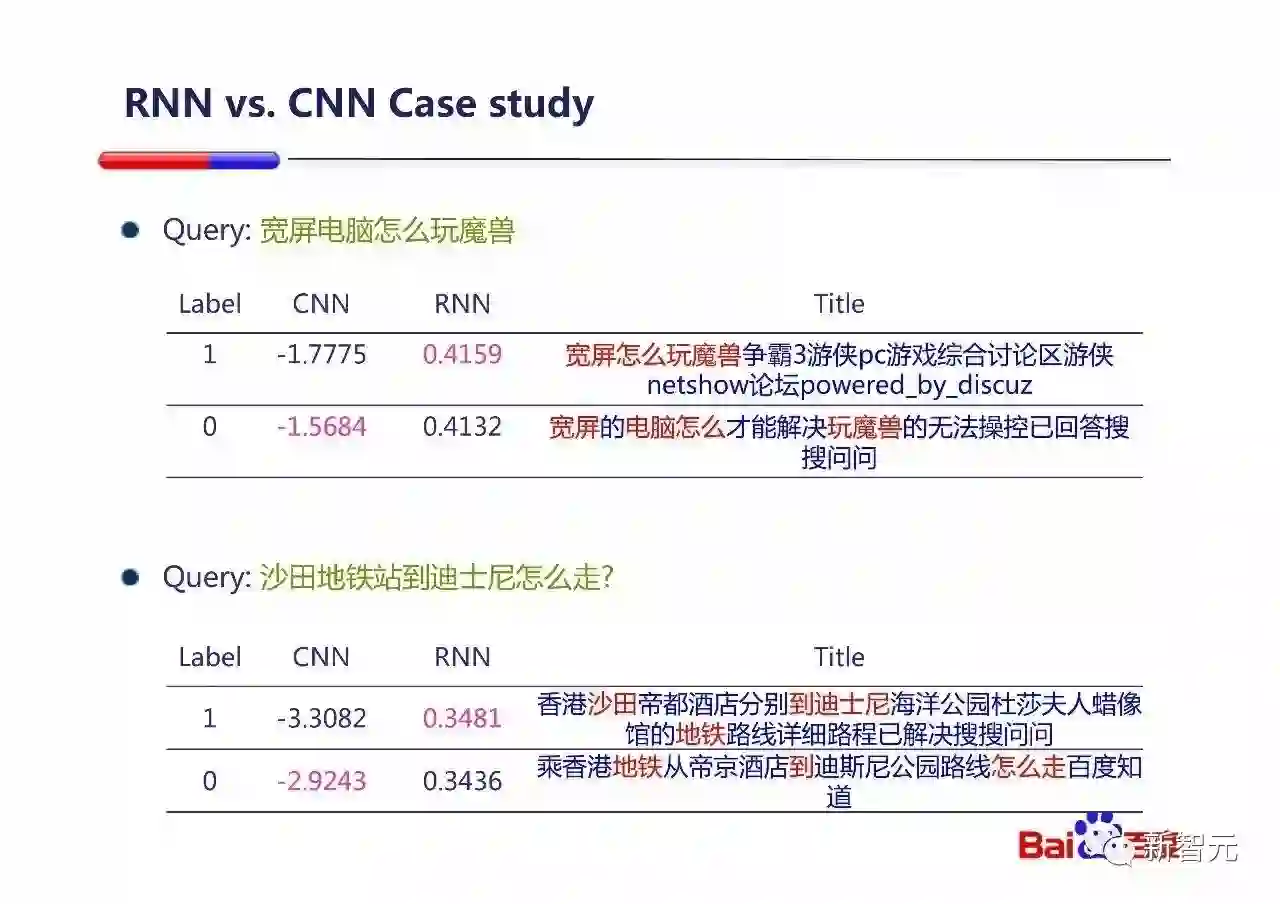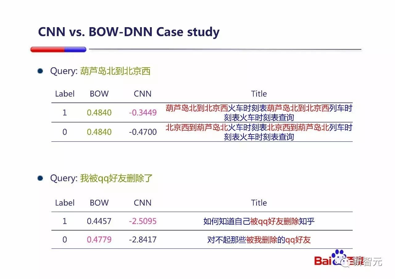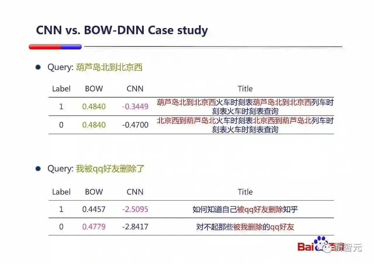 在第一个例子中BOW模型因为不考虑顺序,所以无法区分是从『葫芦岛北到北京西』还是『北京西到葫芦岛北』,给出一样的得分。而CNN模型能够知道哪个才是更加语义相关的。