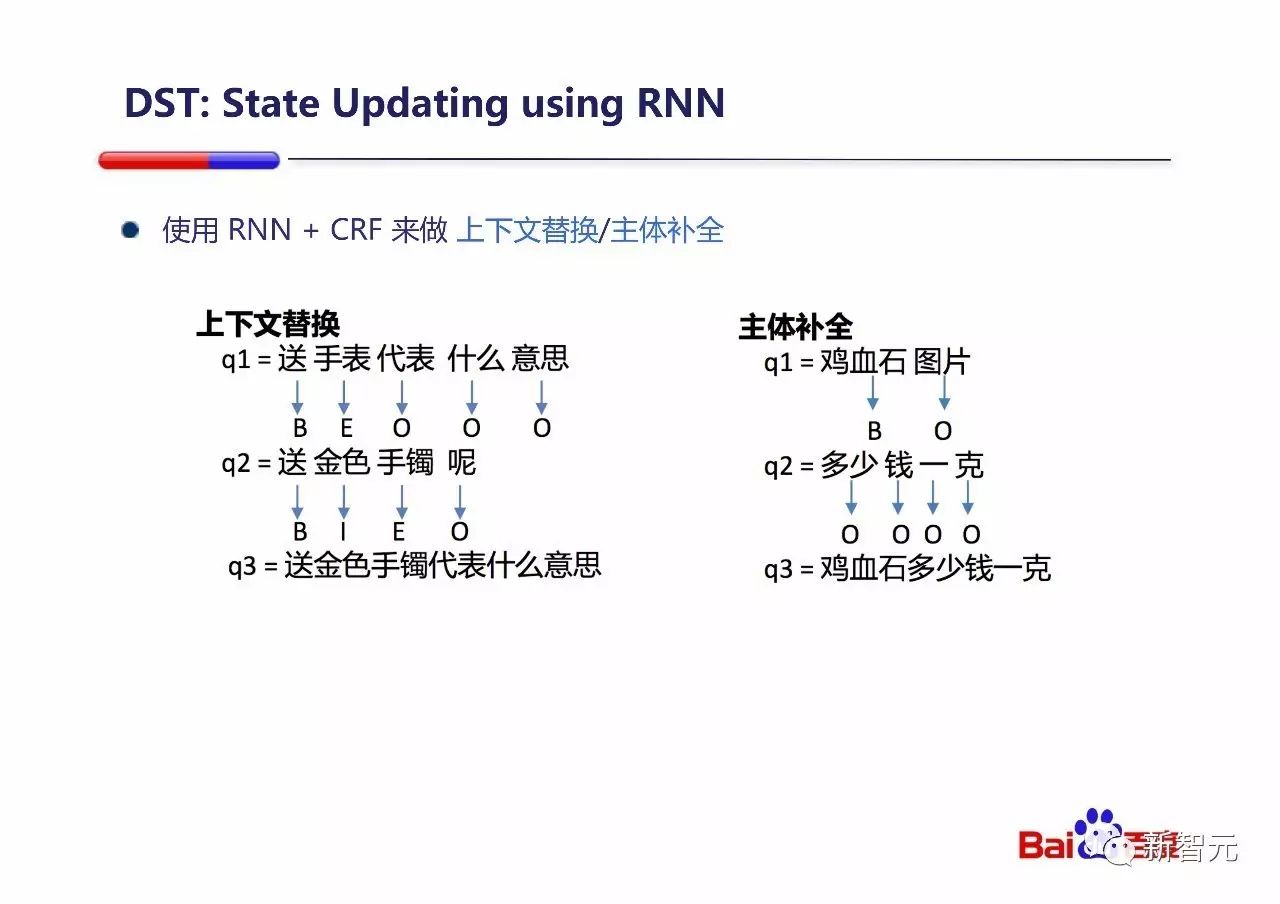 上面两个是在百度系统中的真实Case,通过RNN + CRF来做到的状态更新:用户顺序说Q1,Q2,百度看到Q2会直接更新理解为Q3。