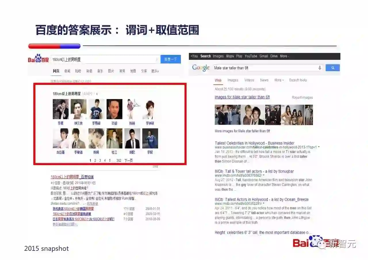 百度支持『谓词+取值范围』方式的推理,例子是『180cm以上的男明星』,百度能够给出符合要求的明星列表,Google不能给出答案。