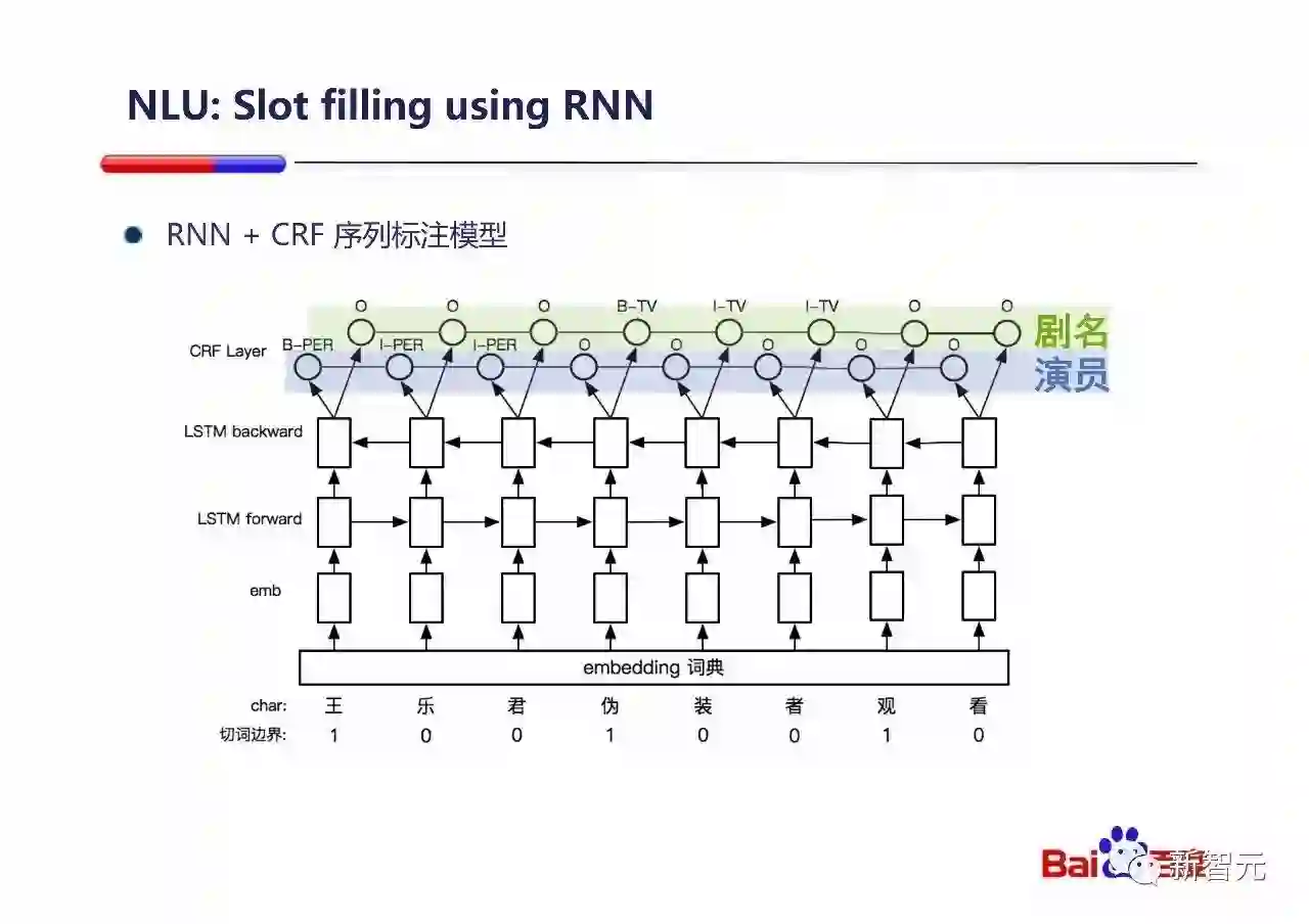 简单讨论下槽位填写的例子,百度采用一个字符级的双向LSTM和CRF层来做槽位填写的标注。如上图,在蓝色的演员这个序列上,『王乐君』就是一个比较可能的候选。『伪装者』就是剧名这个绿色的序列上可能的候选。