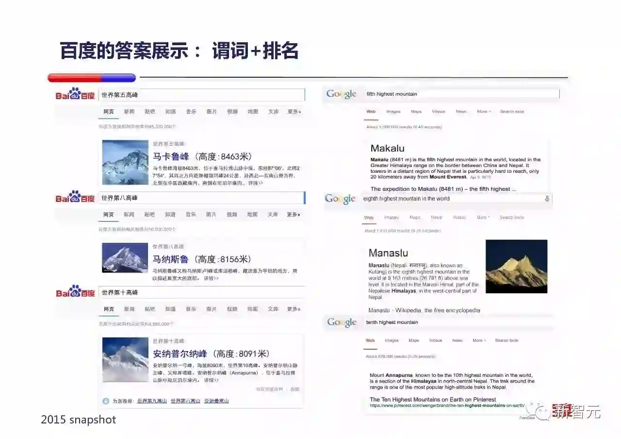百度支持『谓词+排名』方式的推理,例子是『世界第五/第八/第十高峰』,百度能够给出符合要求的知识图谱卡片,Google给出的答案结构不一(有些是知识图谱卡片,有些是web answer卡片)。