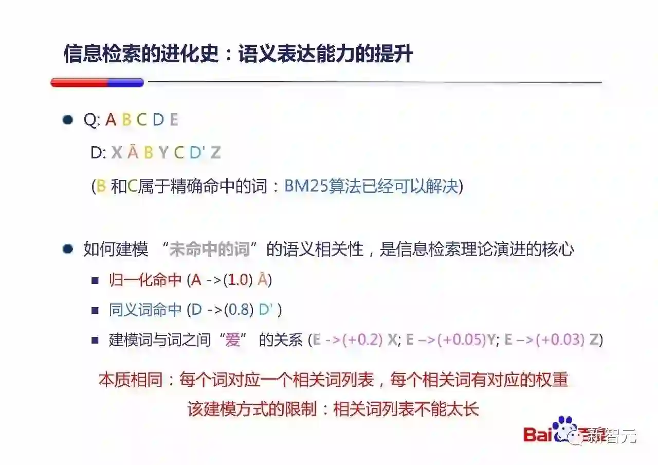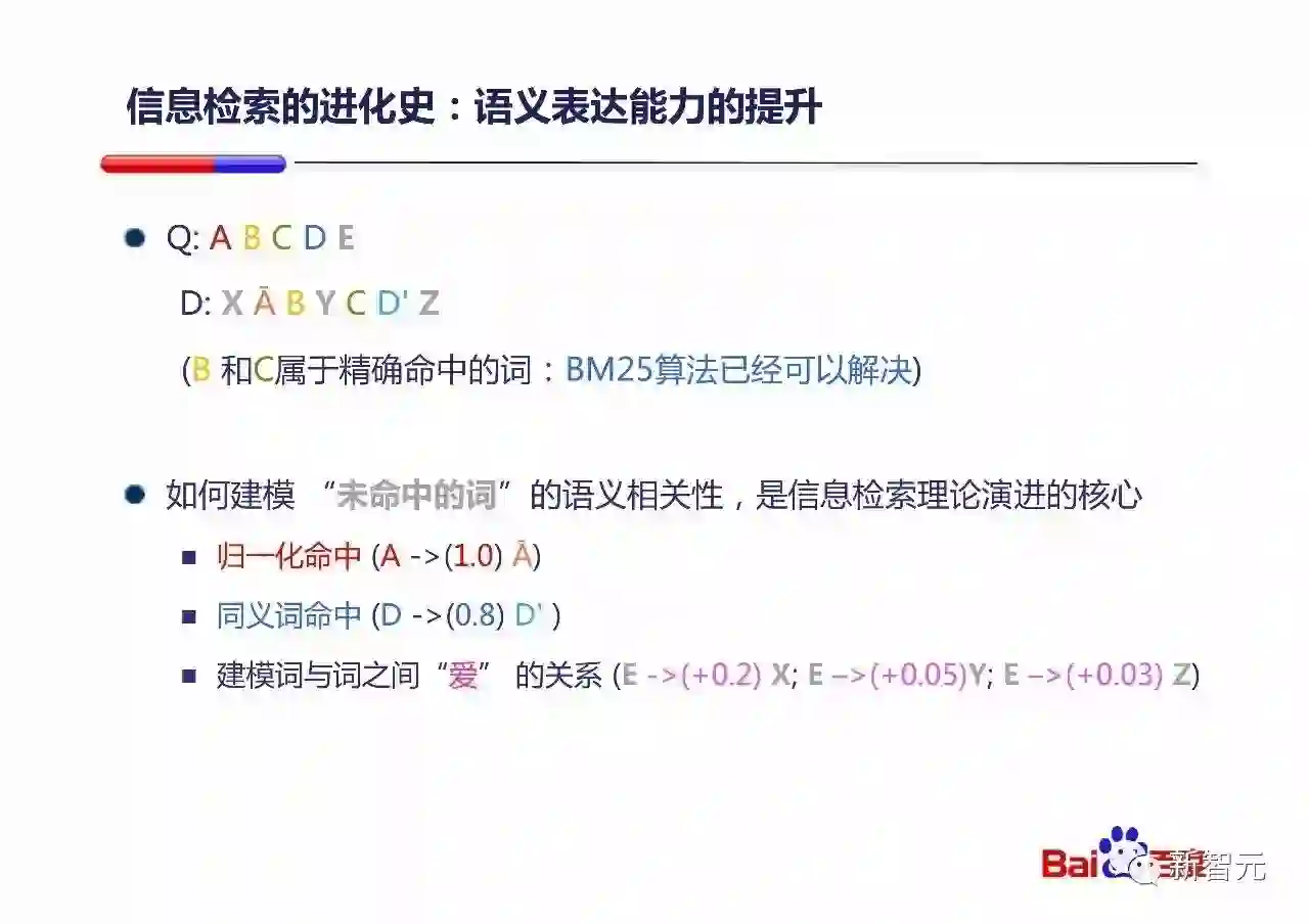 大家会注意到,Document中B和C都属于精确命中Query的Term,他们的对整体语义相关性的贡献可以认为已经被BM25讨论了,我们就不赘述。但是Document中没有命中Query的Term: X Ā Y D' Z,这些『未命中的词』对整体语义相关性的贡献的建模方式的改进,贯穿了信息检索理论的进化。
