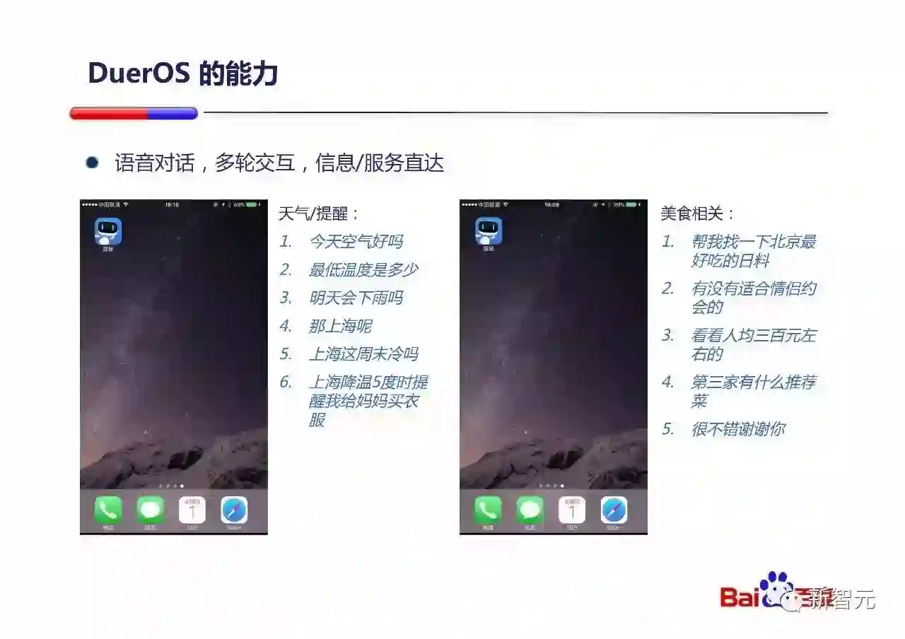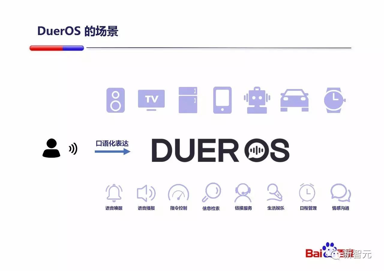 DuerOS的场景如上图所示,它会深入我们生活的场景中(音响、电视、冰箱、手机、家用机器人、车、手表……)并且依托百度整个搜索来给用户提供各种各样的能力。