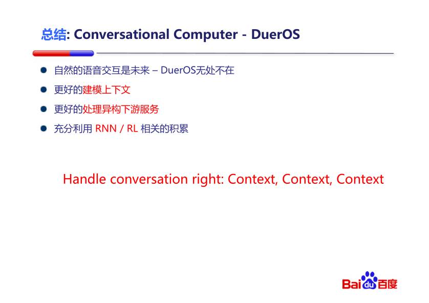 总结一下这一部分,自然的语音交互是未来,未来的DuerOS会是无处不在的。在这样的对话系统中,技术挑战有很多:更好建模上下文,更好的处理异构下游服务……在百度,我们充分利用在深度学习上的积累,相信能够在对话系统中提供让用户感到惊艳的交互体验。