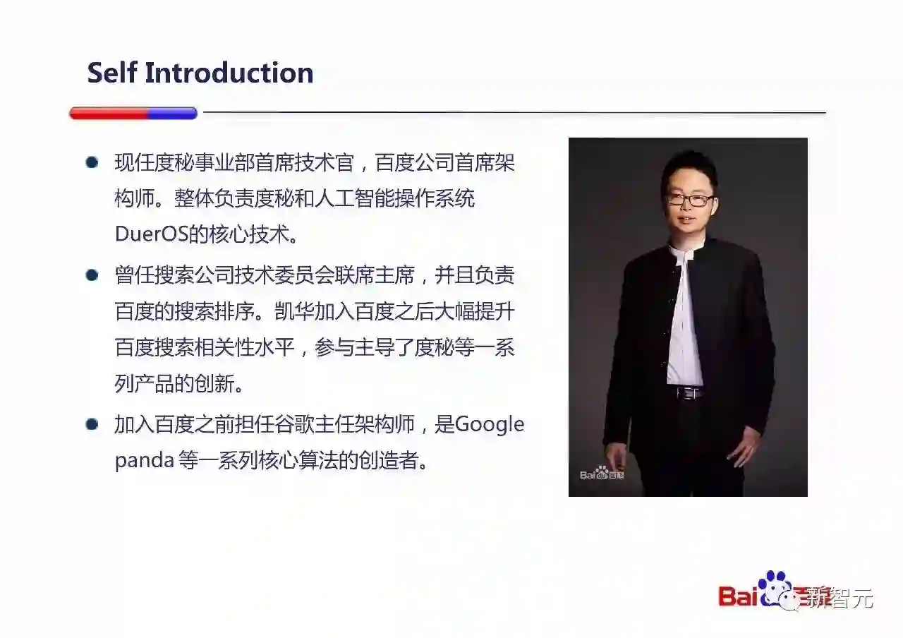 简单介绍一下自己,我之前负责百度的搜索算法,现在技术负责百度的对话式操作系统DuerOS,所以今天分享下在工作过程中遇到的技术挑战,以及学习到的收获。