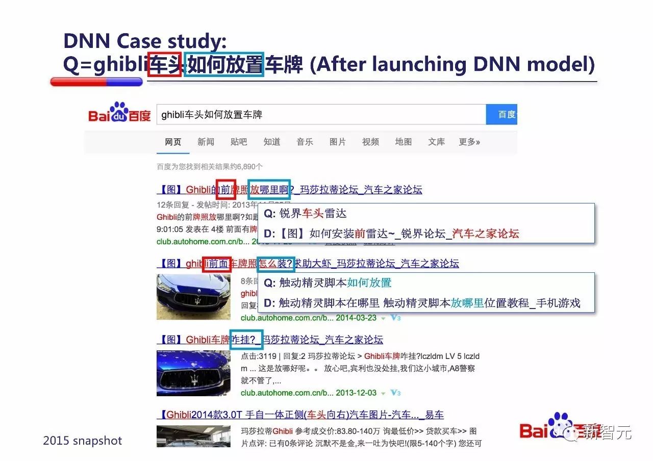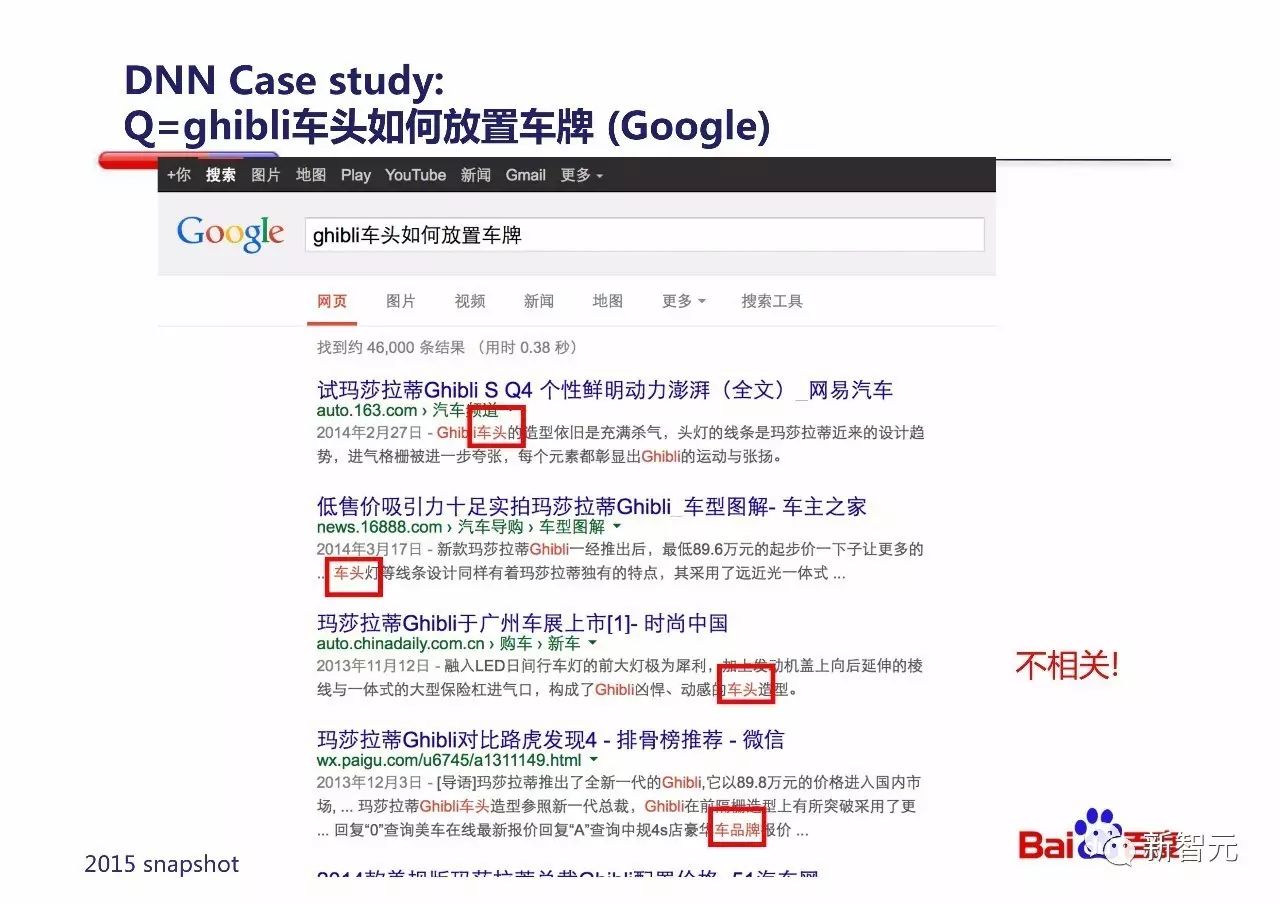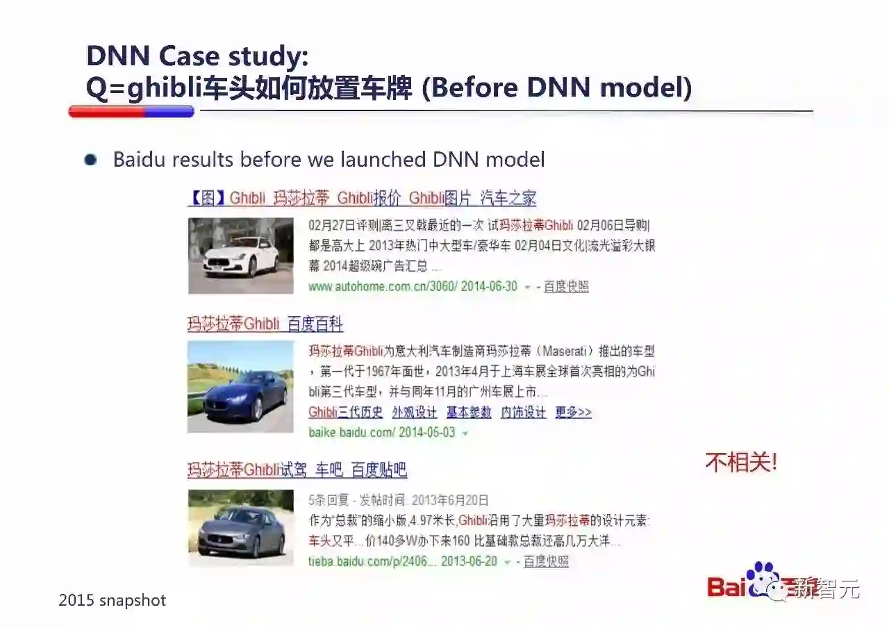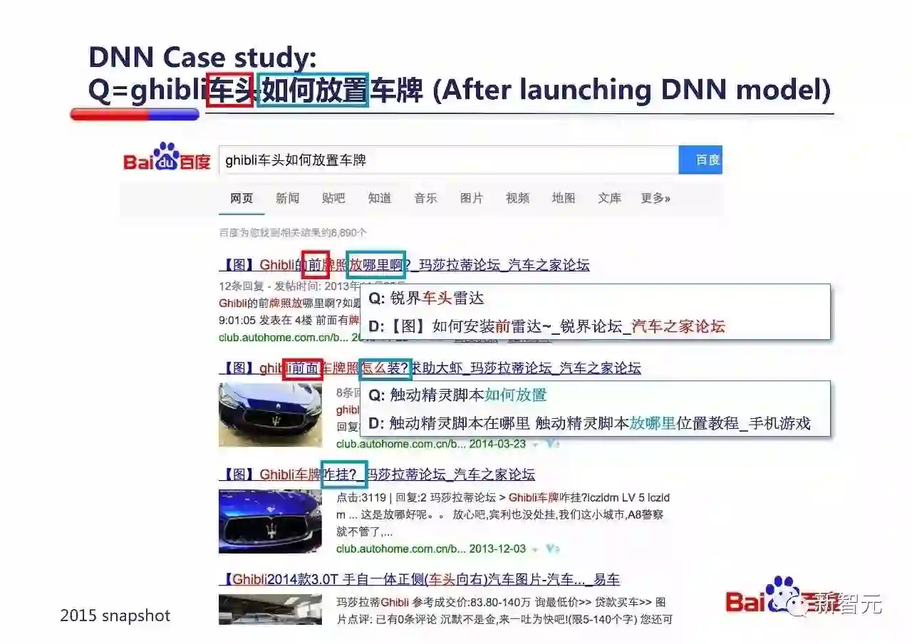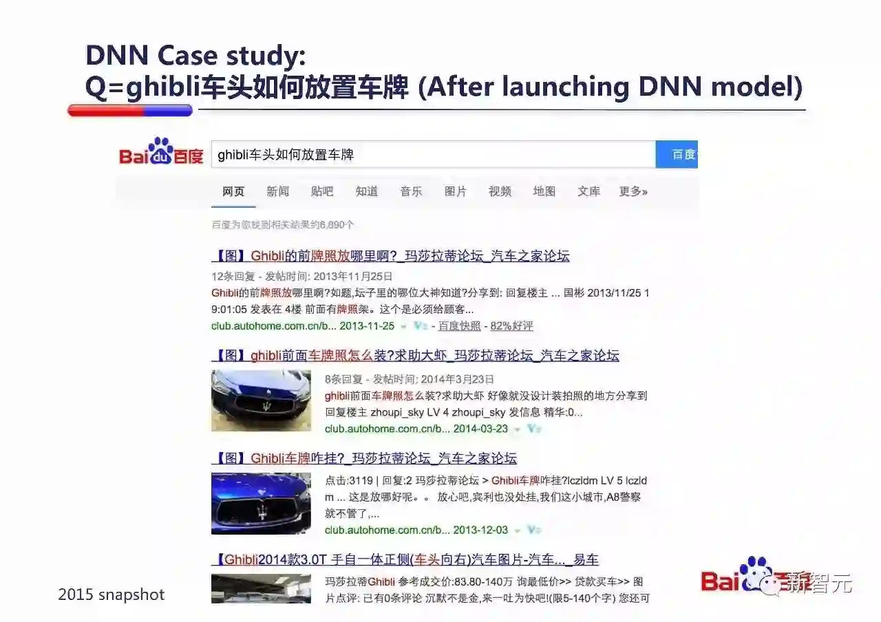 举一个例子,在2013年上线DNN模型之前,如果用户查询百度『ghibli车头如何放置车牌』,由于这款玛莎拉蒂旗下的豪车可能在中国卖的不多,所以相关内容非常少。