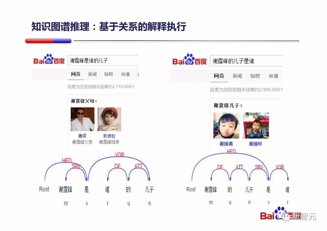 如何进行基于知识图谱的推理,这方面讨论很多,不多赘述。简言之就是按照知识先分析关系,然后在知识图谱上解释执行获取答案。上面的例子是『谢霆锋是谁的儿子』和『谢霆锋的儿子是谁』,虽然这两句话用词差不多,但是依存分析(Dependency Parsing)的解释完全不同,依据依存分析的解释,百度能够执行知识图谱查询并且获得正确的答案。