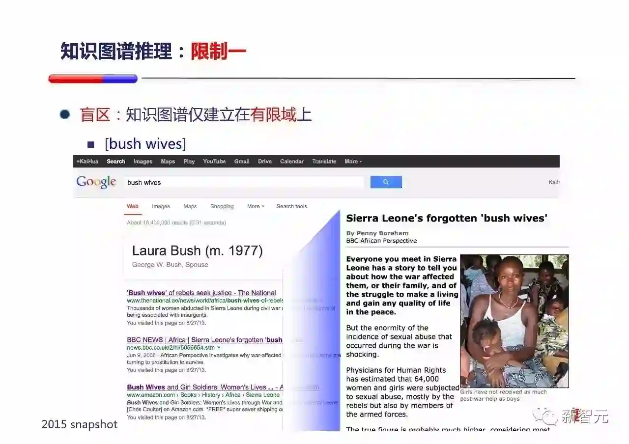 举个例子,看到『Bush wives』大家会猜到什么?一般都会理解为『小布什/老布什的老婆』(虽然wives复数有点奇怪)。包括Google在2015年的时候也是这么理解的(2015年WSDM演讲时的截图,后来Google修复了这个例子),但是如果仔细看一下头几条搜索结果,大家就会发现,bush wives讲的是非洲内战时,被掳获到丛林中充当慰安妇的妇女。
