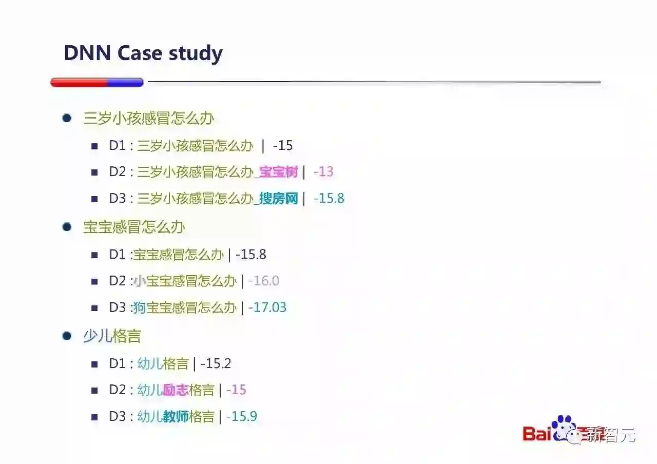 如果Query和Document1都完全相同是『三岁小孩感冒怎么办』的时候,DNN的预测分数是-15;如果我们在Document1后面加『宝宝树』,预测得分立刻大幅提高了(升到-13),虽然『宝宝树』这个词没有出现在Query中,但是DNN模型认为这个词和query其他部分是有语义相关关系的,所以给出了正向的贡献(『爱』)。如果我们在Document1后面加了『搜房网』,预测得分立刻下降了(降到-15.8),因为DNN模型认为这个『搜房网』的出现和query其他部分语义更不相关,所以给出了负向的贡献(『恨』)。这个例子中,其实D2、D3和D1的区别都是增加了一个和Query没关系的Term,在传统的Information Retrieval中是一定会给D2,D3一样的相关性得分,而区别不出两者的差异。