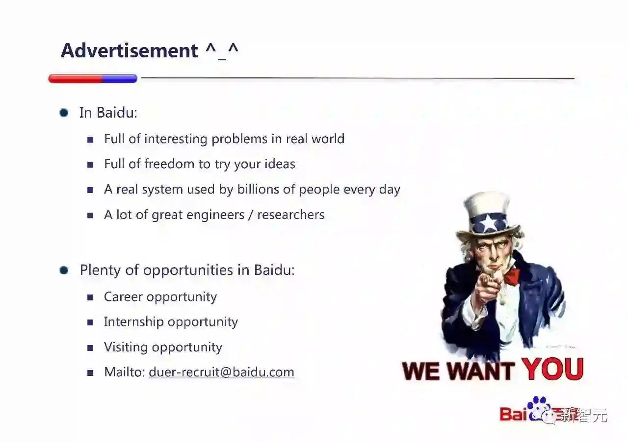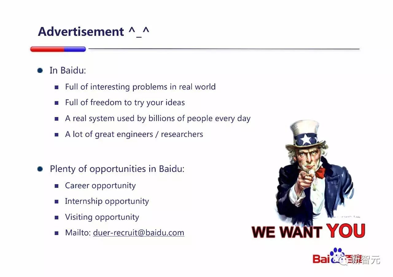我们在百度有非常多的实际有意思的问题,有非常自由的空间来尝试想法,有实际的系统每天被亿万用户使用,我们有非常多的很棒的工程师和研究员。如果你感兴趣,我们提供各种各样的机会,请发信来:duer-recruit@baidu.com。 :)
