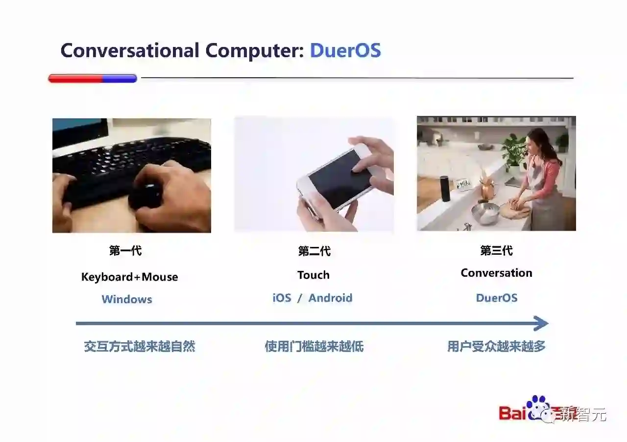 首先,我们有一个观点:从用户和计算机的交互方式来看,以DuerOS为代表的对话式计算机将会是第三代的操作系统。