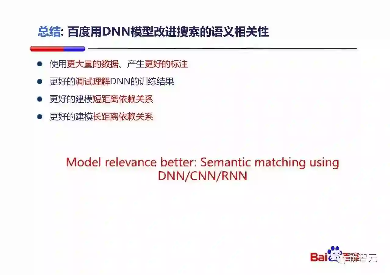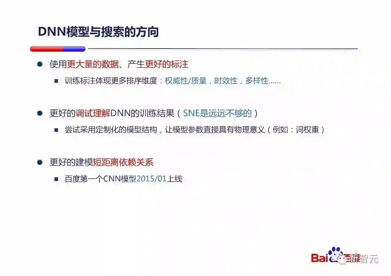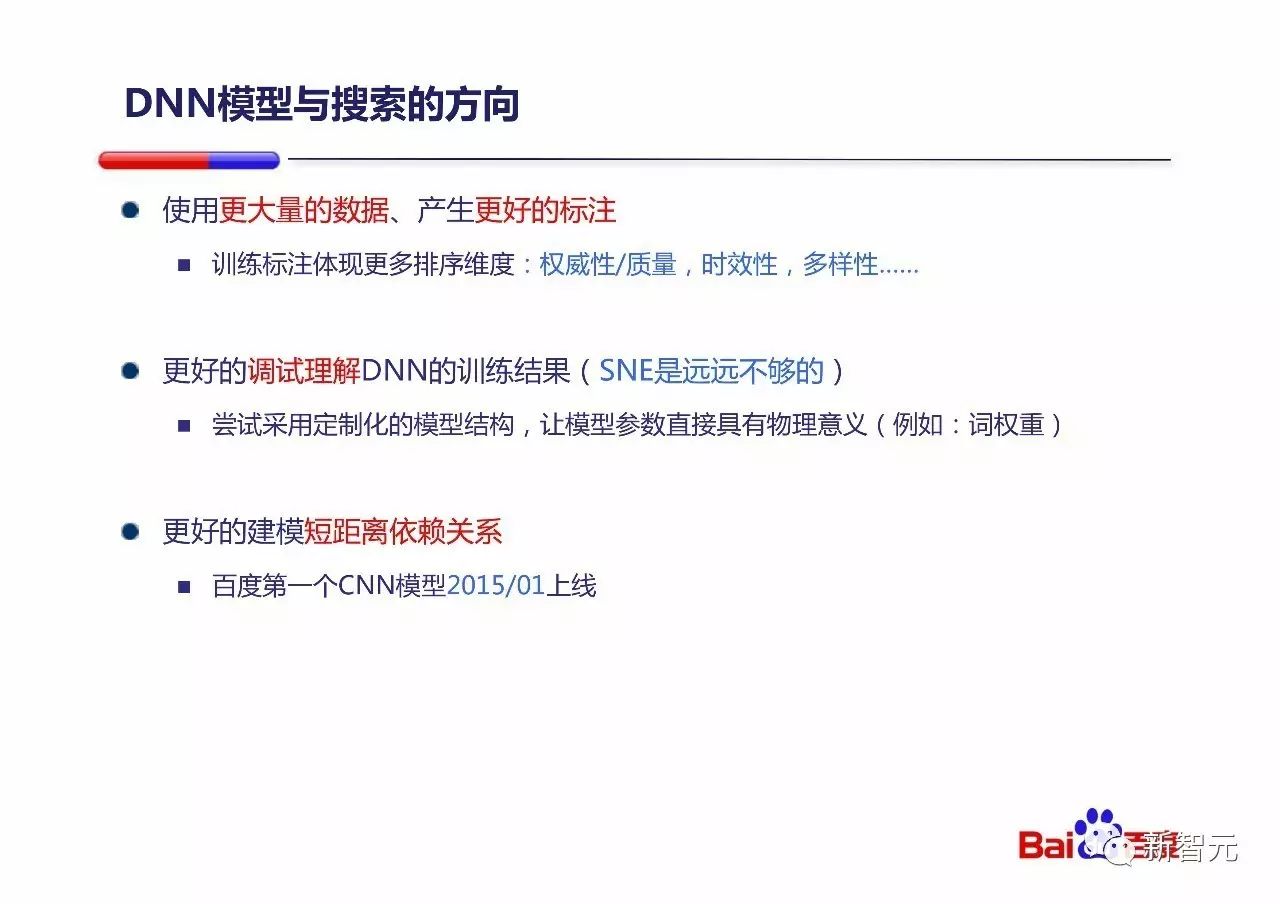 百度通过100亿的用户点击数据来训练一个DNN模型,该模型有超过1亿个参数。该模型2013年12月第一次上线,之后持续给百度的相关性带来非常大的提高。(2014年之后数据由于保密原因,不方便透露。)