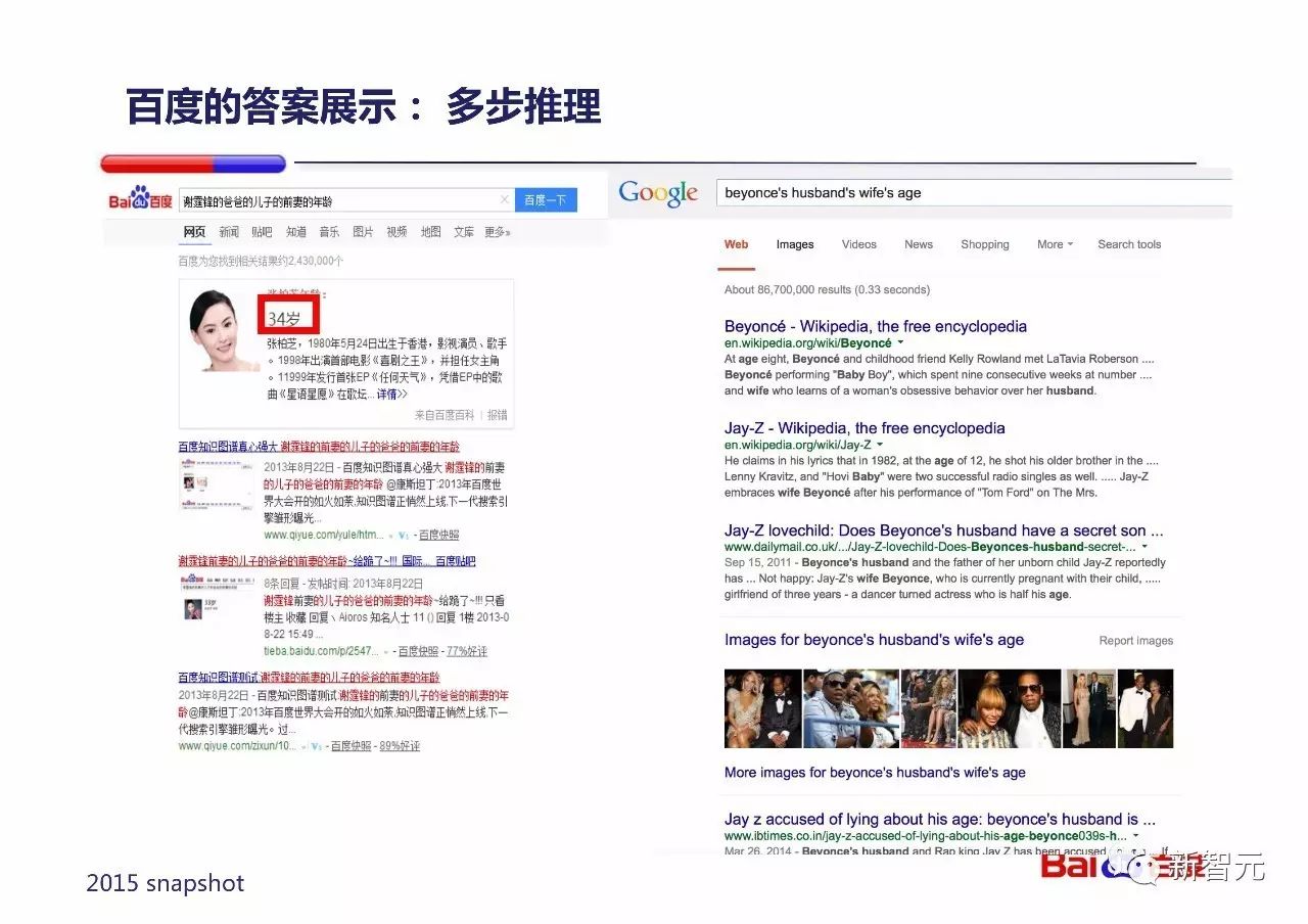 百度支持多步推理,例子是『谢霆锋的爸爸的儿子的前妻的年龄』,百度能够通过多步推理给出答案,而Google不能给出答案(虽然真实用户不太会真的这样搜索百度,但是这个例子体现的是能力的差异)。