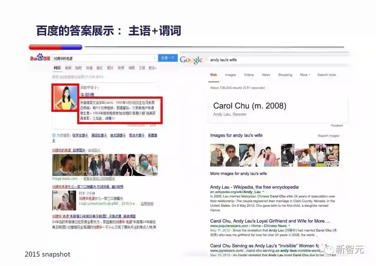 百度支持『主语+谓词』方式的推理,例子是『刘德华的老婆』,百度和Google都能给出答案。但从产品上百度更丰富的给出答案的详细信息。