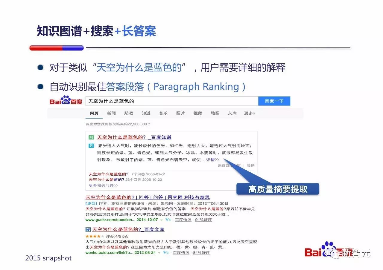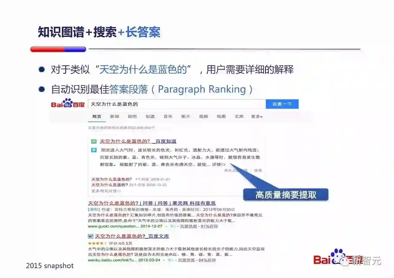 类似“天空为什么是蓝色的”这样的Query,用户需要详细的解释,我们可以把这个问题转化为在知识图谱的帮助下,自动识别最佳答案段落(Paragraph Ranking)的问题。这就会是一个百度很擅长的排序问题,我们能找出最精简描述『瑞利散射』的段落。