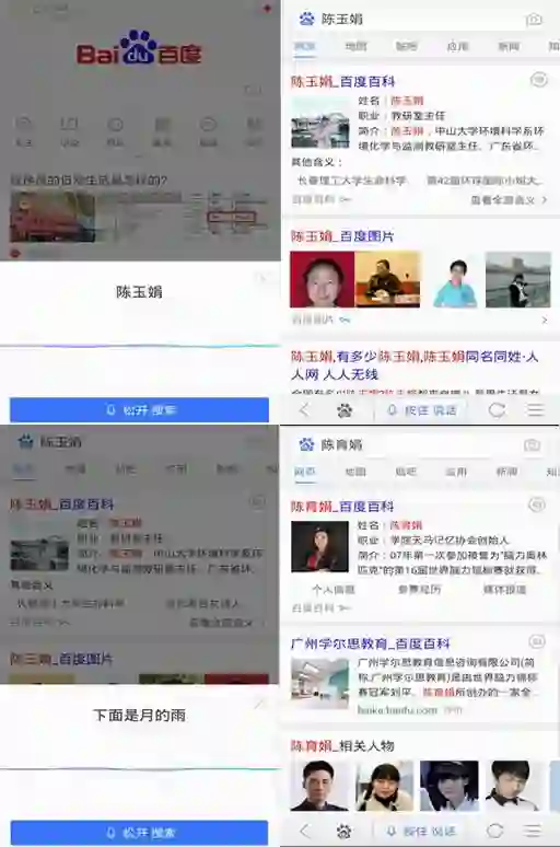 用于语音搜索『chen’yu’juan』;百度给出结果是『陈玉娟』,用户纠正『下面是月的雨(育)』,最后一个字还是别错了,但是百度可以给出正确的『陈育娟』的结果。