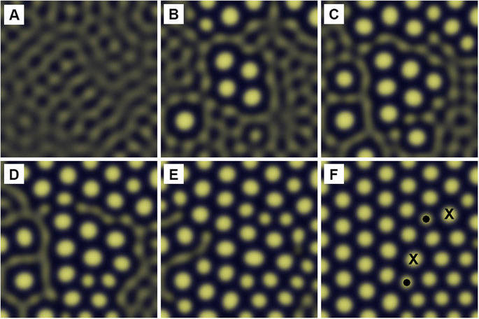 还比如二维的反应扩散系统中的图灵斑图(如下图,是一个系统中的空间上的物质分布随时间变化而逐渐变化,形成斑图的过程[3]),我们现在关注的是某种化学物质在各处的浓度作为一个整体呈现给我们的在一个面上的分布样子(有些地方浓度高,有些地方浓度低,整体的分布呈现一定的规律);因此我们用 PDE 来描述这个动力学空间中的曲面的变化,它在空间上需要两个维度,时间上需要一个维度。