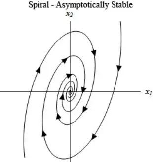 比如下图,是一个二维空间中的稳定螺旋点周围的两个点的运动随时间变化而逐渐趋于不动点所形成的两条轨迹[1]。