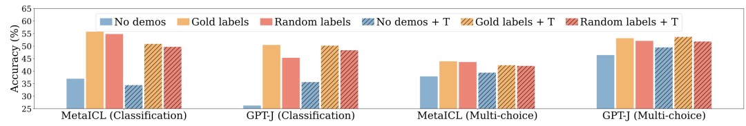 下图中,青绿色的柱子为用随机词汇替代展示样本中的标签。可以看到,模型表现明显下降。因此,in-context learning中,展示样本中的标签内容与测试样本的标签内容的一致性是比较重要的。猜测模型很可能从展示样本中学到了标签词汇的分布。