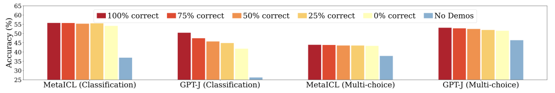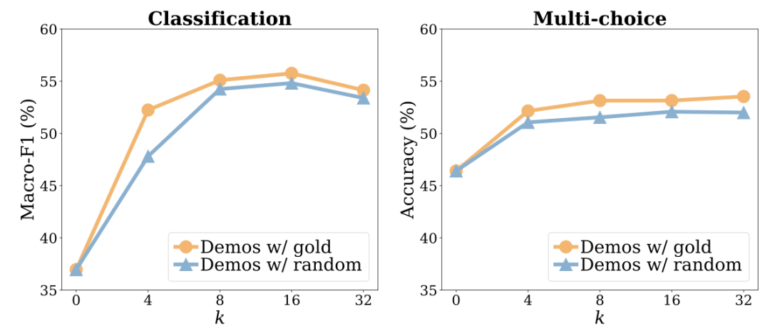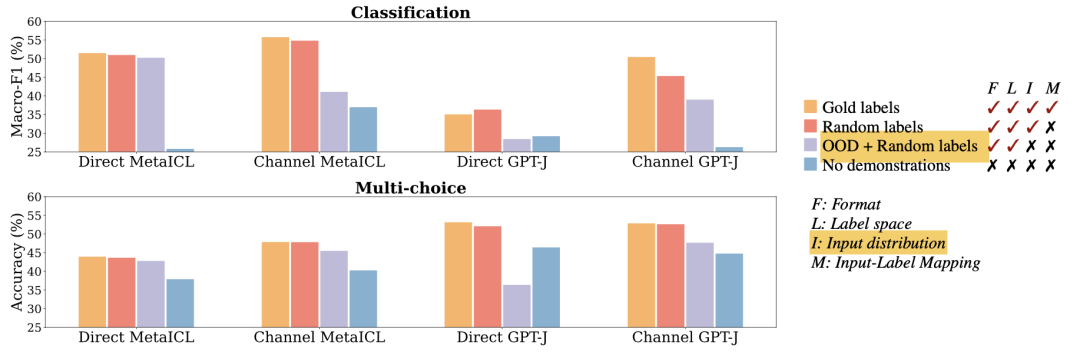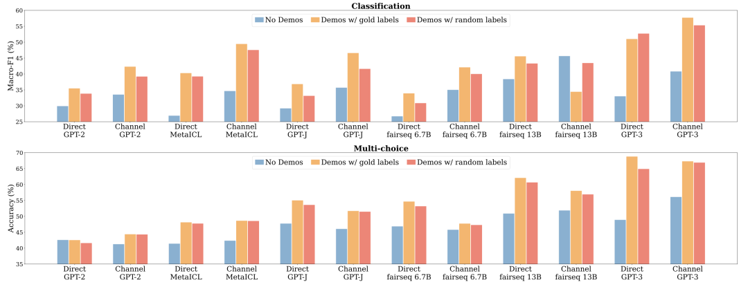 通过给in-context的训练样本赋予随机标签,可以构建随机标注的设置。从下图中可以看出,无论是分类任务(上),还是多项选择任务(下),随机标注设置下(红)模型表现均和正确标注(黄)表现相当,且明显超过没有in-context样本的zero-shot 设置(蓝)。
