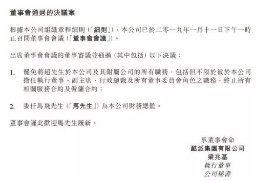 【TechWeb】1月14日消息,酷派日前发布公告称,公司已于2019年1月11日召开董事会会议,出席董事会会议的董事审议并通过(其中包括)以下决议:罢免蒋超于公司及其附属公司的所有职务,包括但不限于彼于公司担任执行董事、副主席、行政总裁及所有董事委员会角色职务。终止所有相关服务合约及雇佣合约。