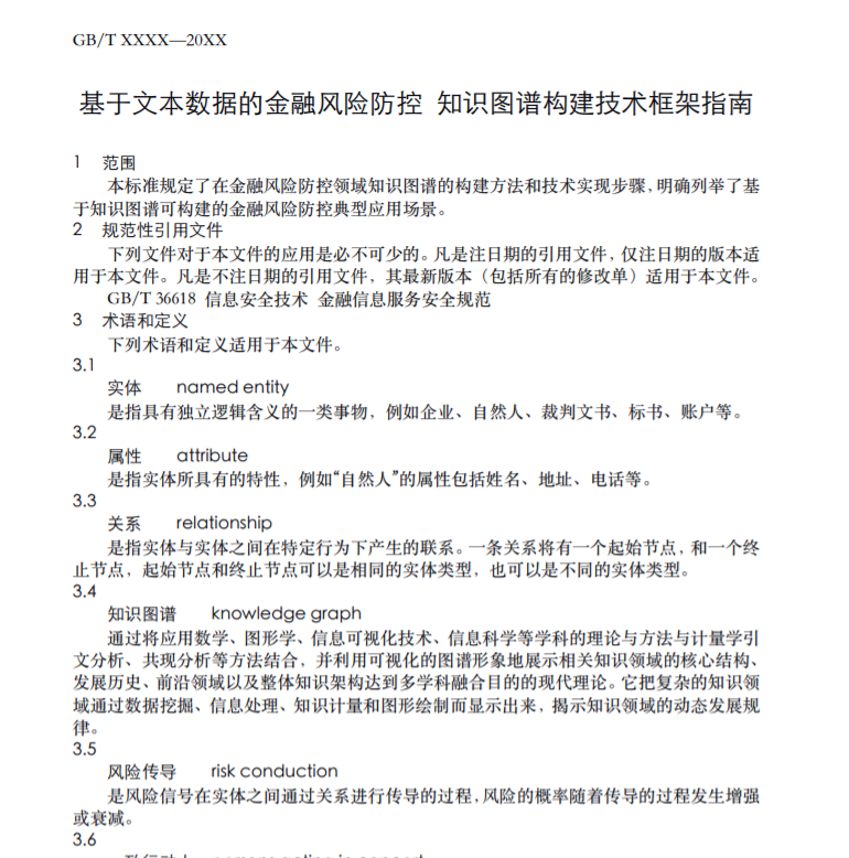 第一章:范围。本标准规定了在金融风险防控领域知识 图谱的构建方法和技术实现步骤,明确列举了基于知识图谱 可构建的金融风险防控典型应用场景。