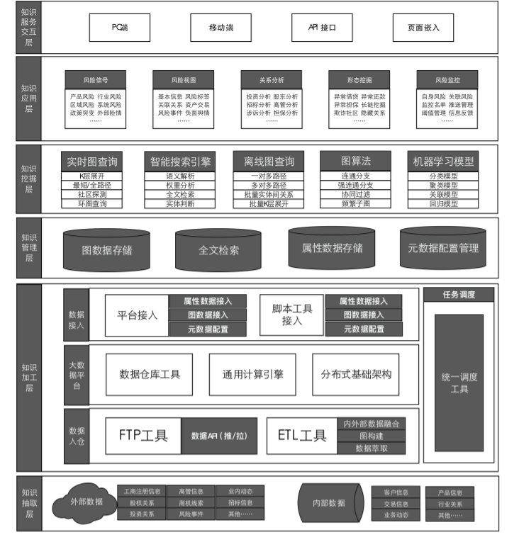 知识图谱将数据加工为知识,并通过智能分析挖掘,提炼形成风险防控的方法论和技术 实施路径。知识图谱整体架构如图 1 所示: