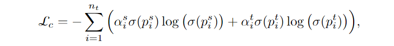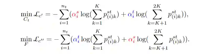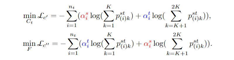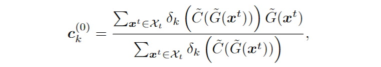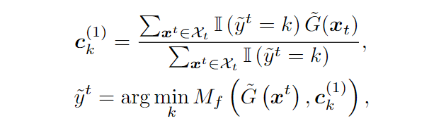 每个类的特征分布质心也被认为是一个原型表示(来了,又融合了 prototype learning),它的分布应该出现在分类器能够自信预测大量样本的区域。质心的更新类似于 k-means 聚类,通过用分类器的置信度加权每个目标特征: