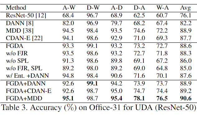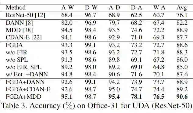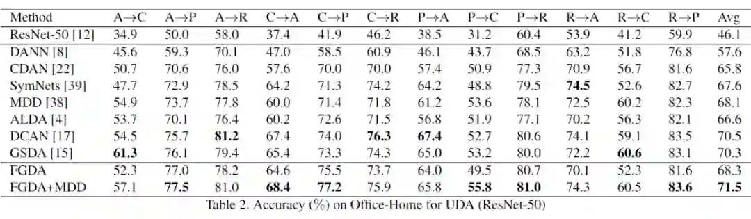 首先 FGDA 与传统减少 domain discrepancy 的方法结合摸到了 sota。虽然 FGDA 单独拿出来效果并没有想象的那么理想,但是 FGDA 毕竟是和现有方法正交的。