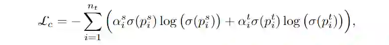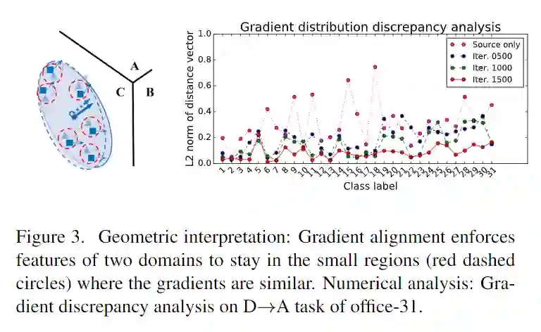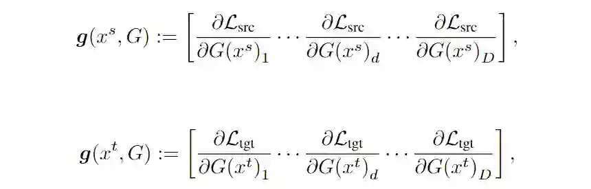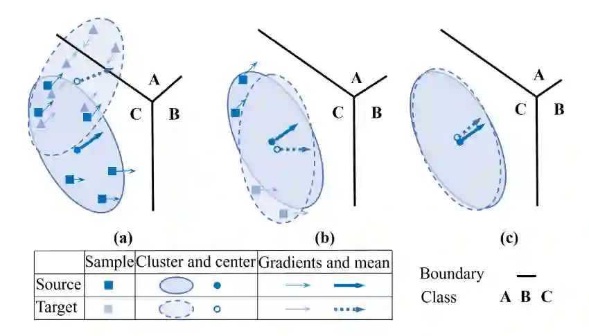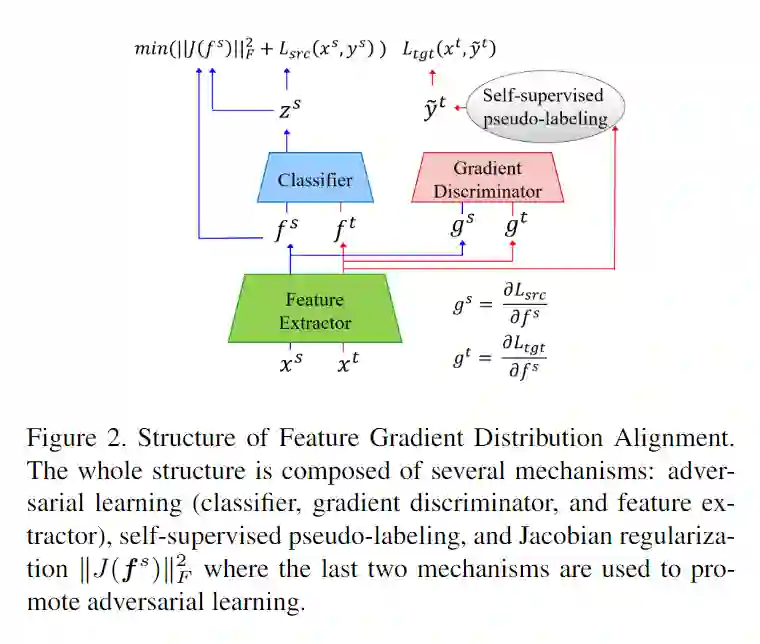 文中依然是使用了对抗学习来,具体来说,鉴别器预测源域和目标域特征梯度的域标签,而特征提取器学习混淆鉴别器。当达到均衡时,特征分布差异达到最小值。