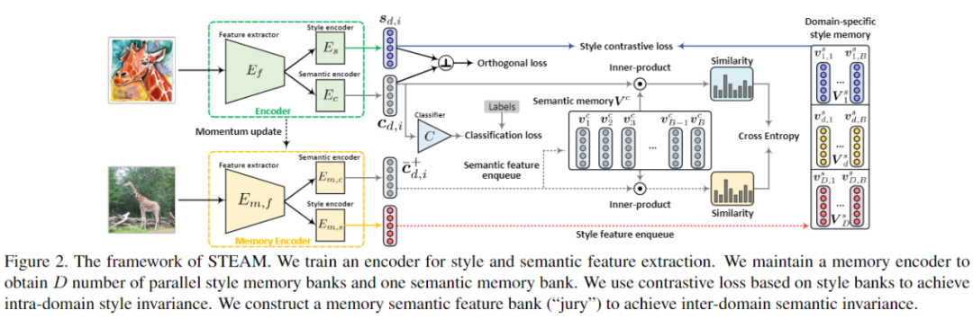 2. 重点在于风格信息的处理。首先和语义分类计算一个正交的 loss,然后每个 domain 维护一个 memory bank,分别对每个 domain 的风格相似度计算一个 contrastive loss 来保证同一 domain 风格信息接近。