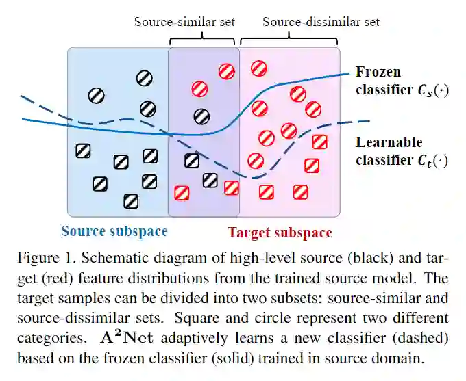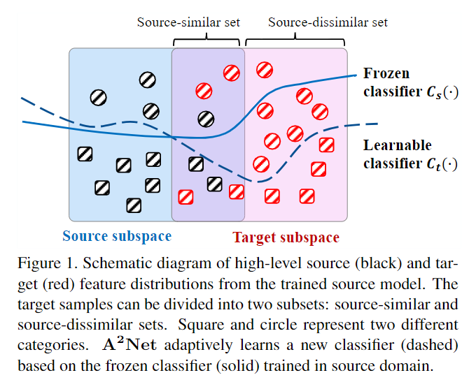 本文关注 source free domain adaptation:即训练过程中我们拿不到源数据,只能拿到在源域训练好的模型。本文的 intuition 在于,如果源数据本身极度不平衡或者存在偏差,那么分类器本身就不太合理。由于受到冻结分类器的限制,这个时候他很难在距离 source distribution 远的分布上表现的好。从另一个角度,本文提出了一个问题:在模型优化过程中,我们能否寻找一种新的针对目标的分类器,并使其适应目标特征?