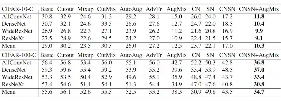 CN+SN 的方法在绝大多数 backbone上的效果好于现有的数据增强的方法,而且 CNSN 和他们是正交的,CNSN 不依赖于任何形式的图像操作,将 CNSN 与 augmix 结合之后效果来到了目前的 SOTA。文中还有更多数据集以及 numerical 的实验,这里不再赘述。